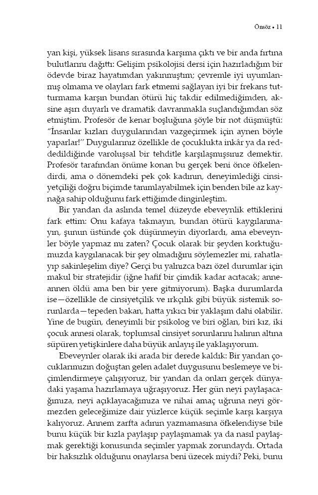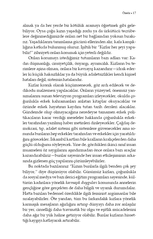 Dünya, kızlar için karmakarışık mesajlarla dolu: Hakkınızı savunun ama bunu yumuşak bir şekilde yapın; bağımsız olun ama evde kalmayın; bedeninizi sevin ama onun ağdalı ve fit olmasına dikkat edin. Elbette daha doğrudan bir horgörü de var: Üstten üstten konuşmalar, düşük maaşlar, izinsiz dokunuşlar, tartışmaya açılan bedensel özerklik hakları, iltifat kisvesine sokulmuş cinselleştirme… Birçok ebeveyn, bu sorunlu gerçekleri tartışmaktansa, kızlara yüzeysel bir motivasyon aşılamayı (“Kız gücü!”) daha kolay buluyor. Oysa kızların depresyon, anksiyete ve intihar oranları hızla artarken acilen müdahale etmemiz gereken sorunlar var: Kızların iyimser ruh halini ve değişim yaratma şevkini ezip geçmeden onlara bu gerçekleri nasıl anlatabilir, bunlarla mücadele etmeyi nasıl öğretebiliriz?