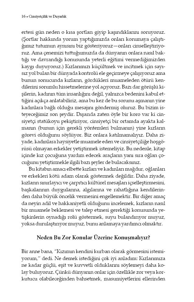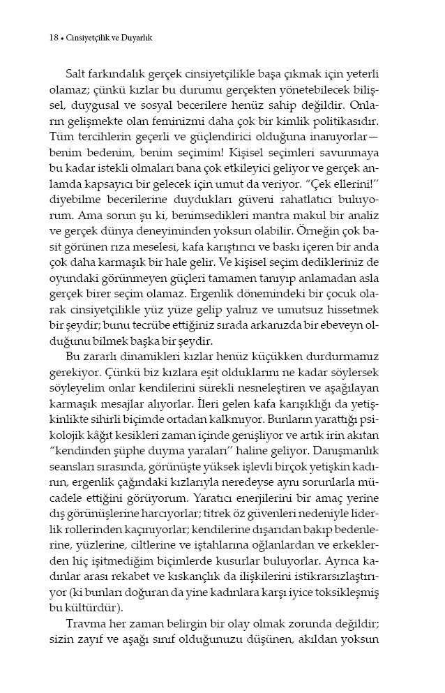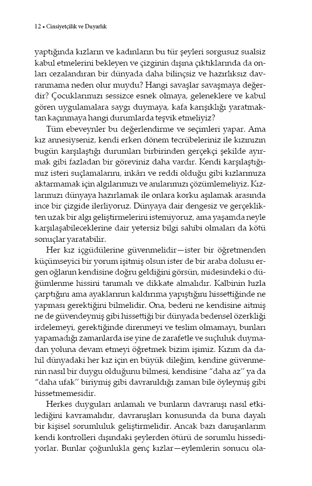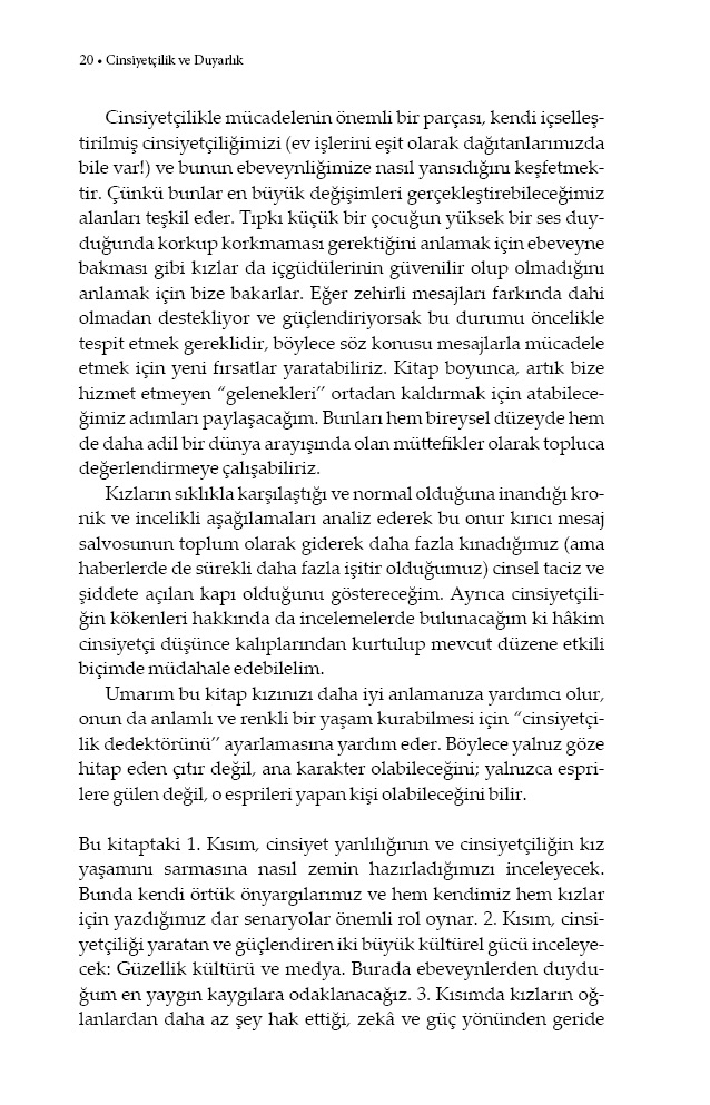 Kızları yanlılık ve cinsiyetçilikten tamamen koruyamayız. Ama onların bu sorunlar karşısında bizim gençliğimize göre daha bilinçli ve hazırlıklı olmasını sağlayabiliriz. Gerçek yaşam örneklerine ve yirmi yılı aşkın terapi deneyimine dayanan Cinsiyetçilik ve Duyarlık, kızını cinsiyetçi akımlarda yetiştirmek zorunda kalan her ebeveyn için ufuk açıcı bir temel kaynak olacak.