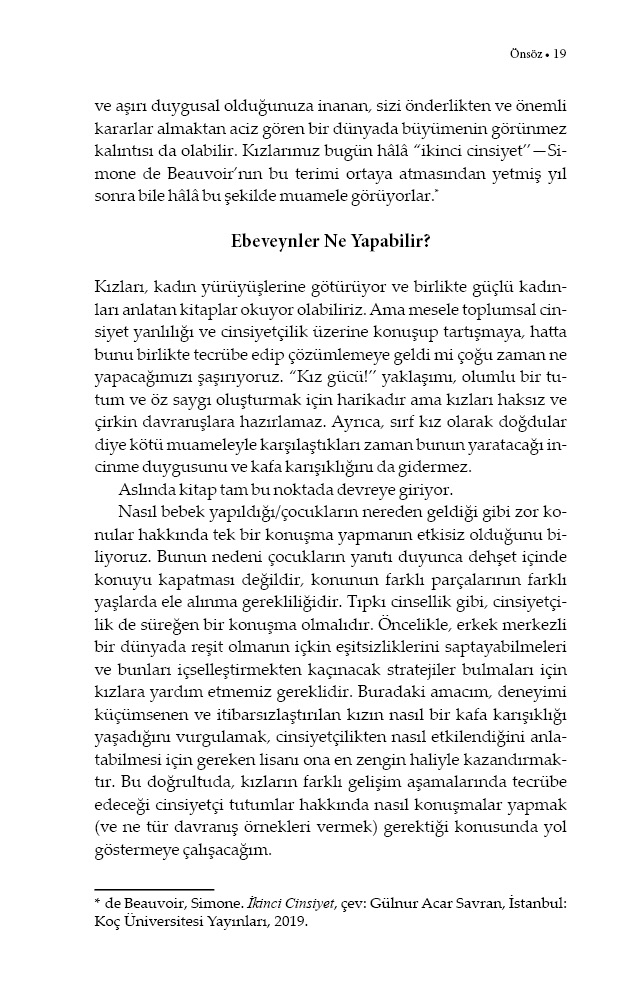 “Bu kitap, kızları yetiştirirken karşılaştığımız en zor konularda—kadın düşmanlığı, nesneleştirme, beden imgesi vb.—bize akılcı bir rehberlik sunuyor.”