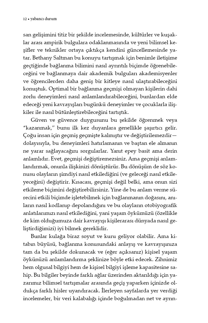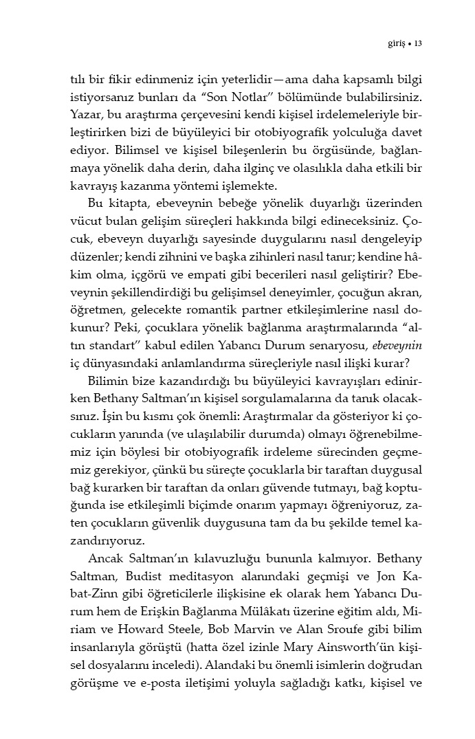 Saltman, titiz bir bilimsel araştırmayı kendi annelik deneyimiyle bütünleştirdiği bu anlatıda, bilimden sevgiye dair yanıtlar istiyor; bağlanmanın ne olduğuna ve ne olmadığına, nasıl kurulduğuna, nasıl güçlendiğine ve zayıfladığına dair gerçekleri araştırıyor. Öğrendikleriyle de bize, bağlarımızı anlamak, yorumlamak ve daha iyi, daha sağlıklı ilişkiler yürütmek için etkili bir kavrayış sunuyor.