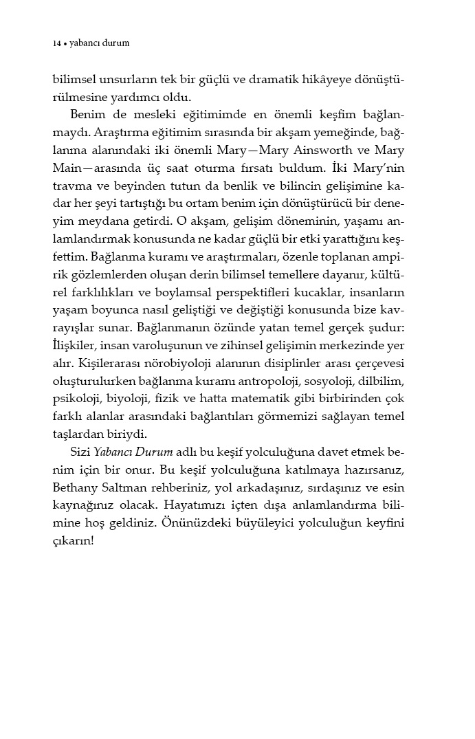 Bağlanma bilimi, ebeveyn ile çocuk arasındaki sevgi bağını evrimsel yönden araştıran bir alandır. Saltman, bir yandan John Bowlby ve Mary Ainsworth’ün bağlanma bilimini nasıl adım adım inşa ettiğine dair bir tarihçe sunarken, bir yandan da ünlü deney yöntemi ‘Yabancı Durum’da toplanmış verilerden yola çıkarak sevginin neden kolay kolay kopmayan bir bağ olduğunu açıklıyor.